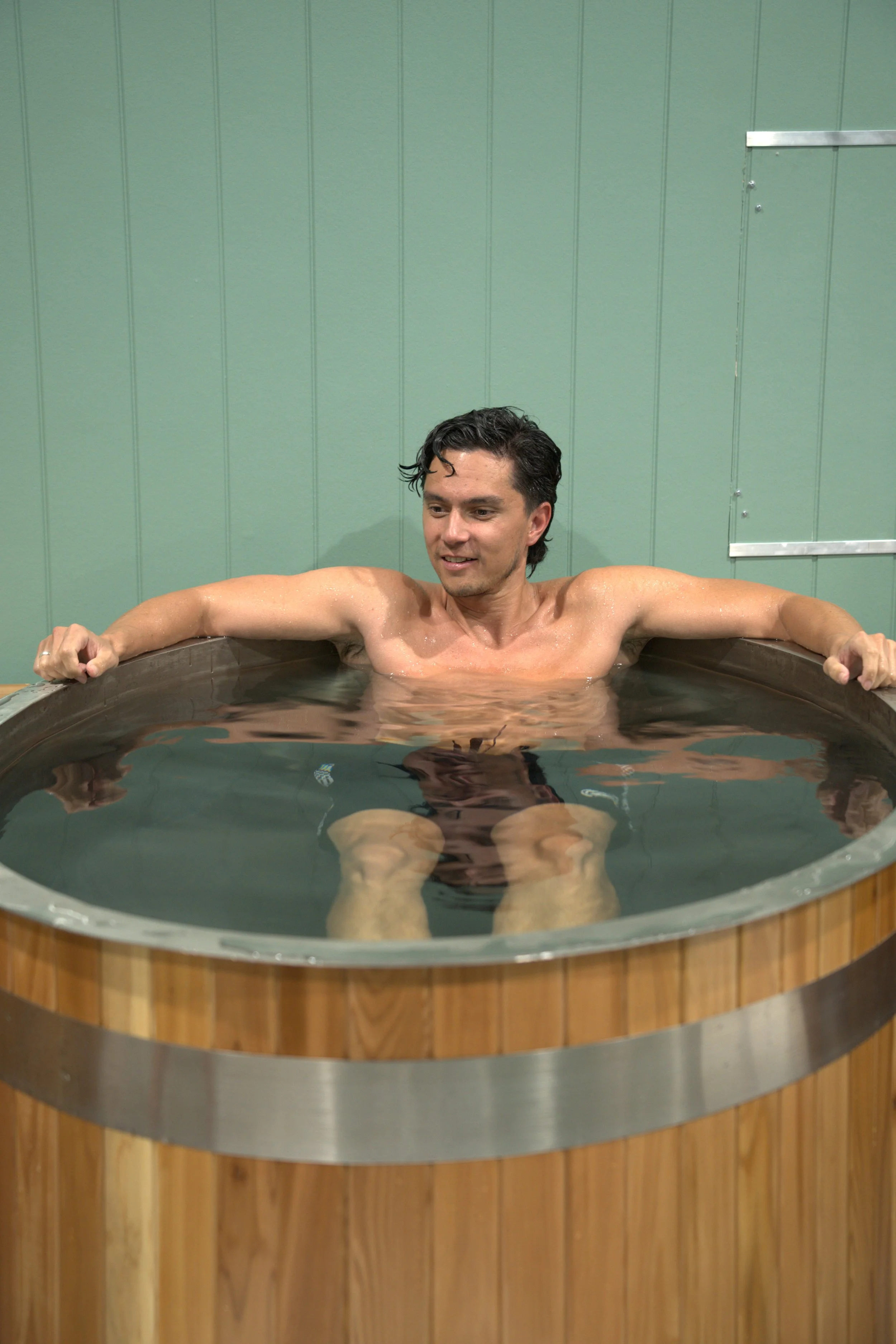 • A woman relaxing in a round wooden Ice Bath with her eyes closed, wearing a black swimsuit, in a room with green paneled walls.