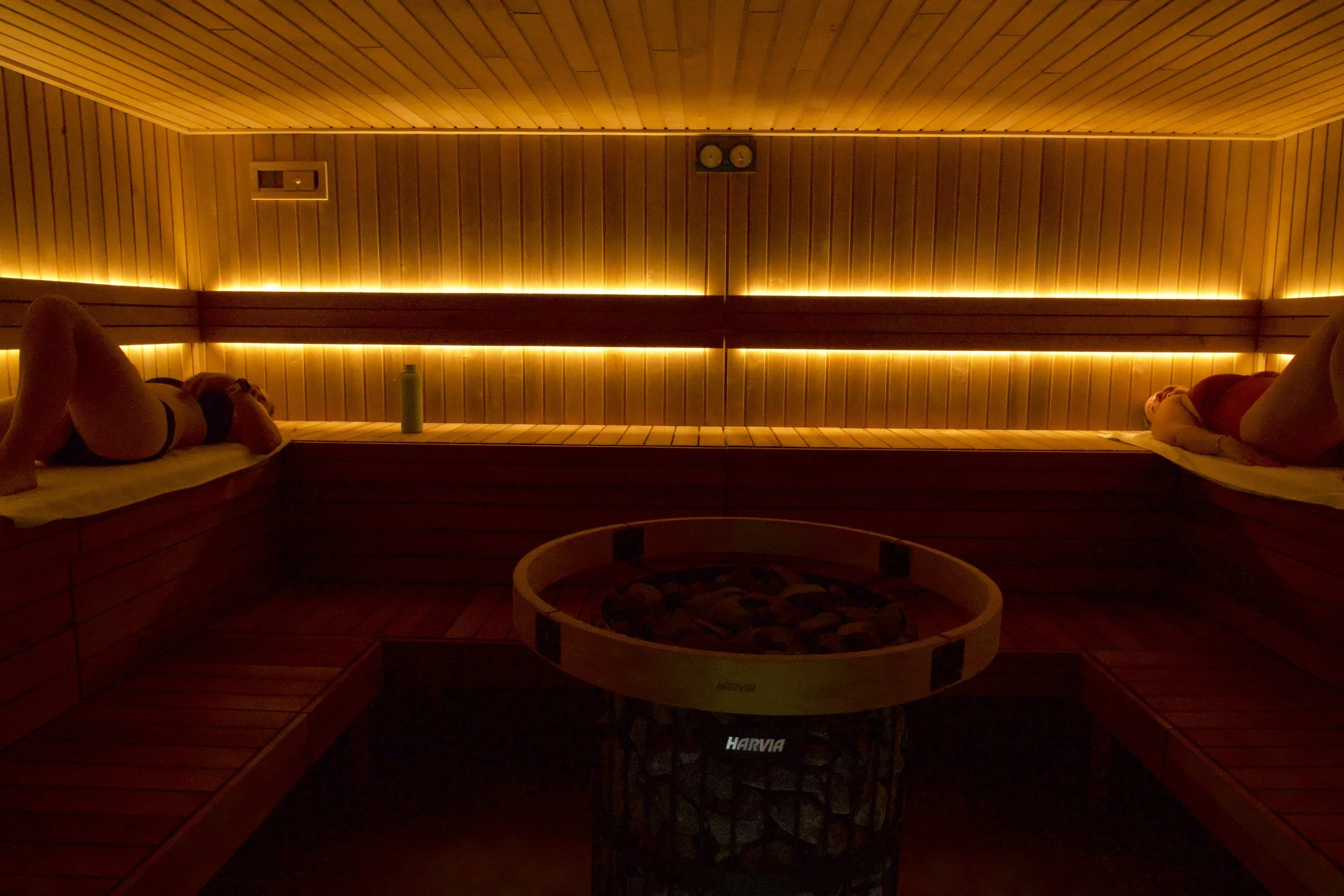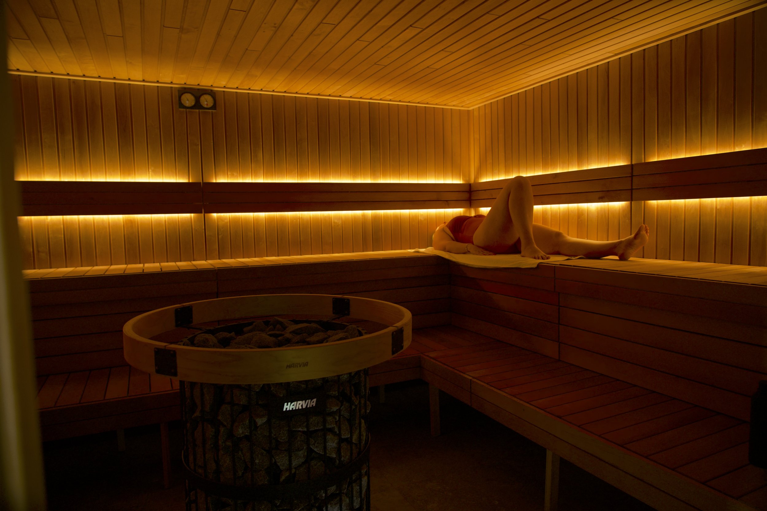 A person lying on a bench inside a wooden sauna with warm lighting, a sauna heater filled with stones in the foreground, and a wall-mounted clock on the ceiling.